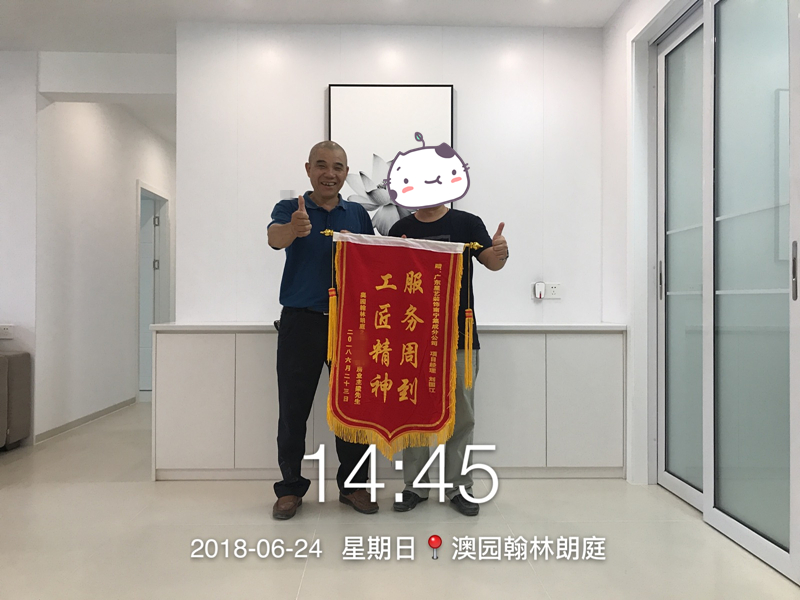 2018年6月23日,奧園瀚林朗庭業(yè)主送來錦旗稱贊廣東星藝裝飾南寧公司項目經理劉國江工匠精神,服務周到。