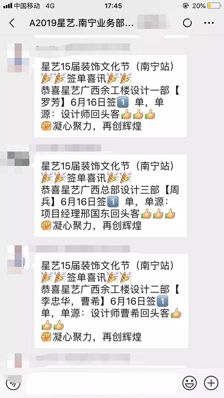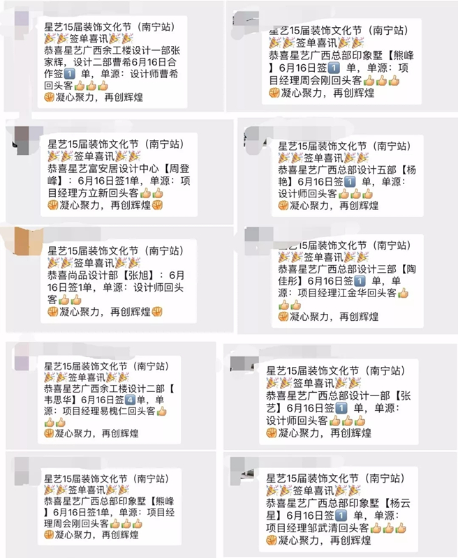 (星藝南寧員工群6月16日回頭客爆單截圖)