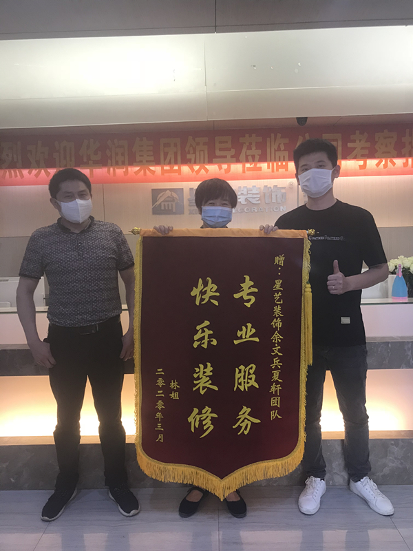 業(yè)主林姐為感謝項目經(jīng)理余文兵和設(shè)計師夏軒,專程來星藝送錦旗,感謝項目經(jīng)理和設(shè)計師的認真負責(zé)。認真工作一定會獲得認可的,我們一定還會繼續(xù)努力提升自己的工作服務(wù)