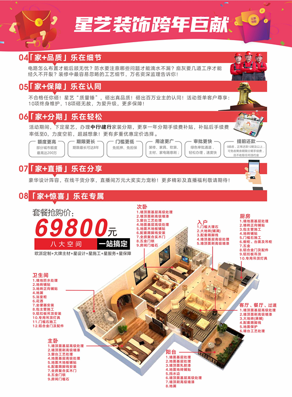 本次活動星藝裝飾隆重推出58套樣板房真情回饋給全市人民,保證整裝價格比自購優(yōu)惠到20%-30%,承諾本次活動價格保價一年,一年裝修按本次活動價格計算,絕不漲價。