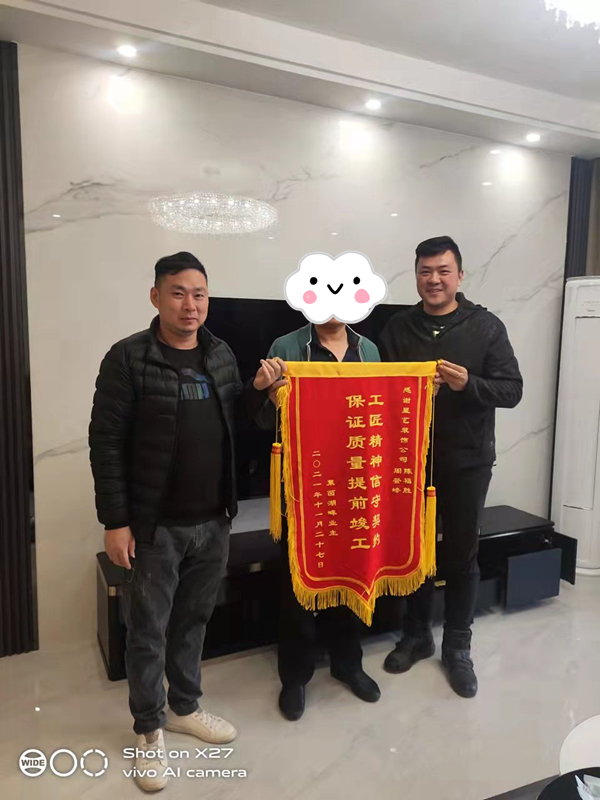 2021年11月27日。萊茵湖畔業(yè)主送來錦旗一幅,這位業(yè)主已經(jīng)是第三次找到星藝裝飾裝修了,項目經(jīng)理陳福勝、設(shè)計師周登峰和業(yè)主合影,錦旗內(nèi)容:工匠精神守契約,保證質(zhì)量提前竣工