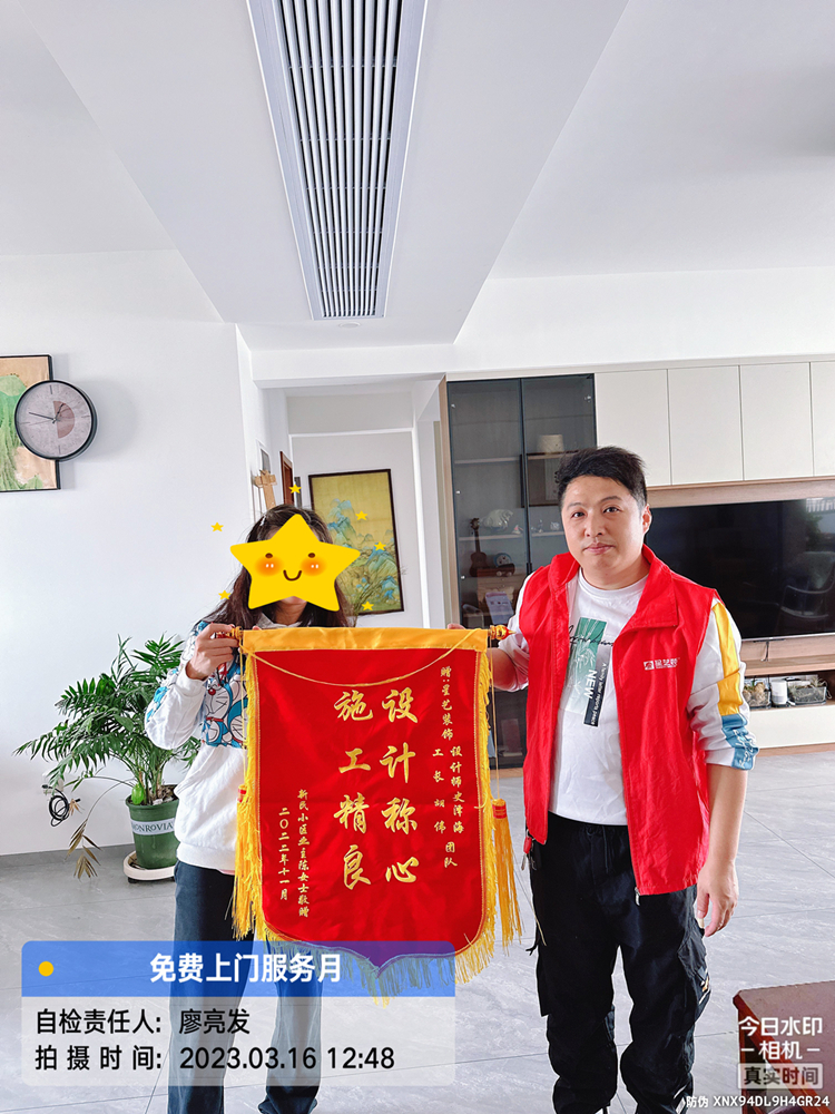 經(jīng)過90天的有序施工,由星藝裝飾公司整體家裝,設(shè)計(jì)并施工的新民路小區(qū)陳女士家正式竣工,并進(jìn)行了星藝裝飾公司施工項(xiàng)目總驗(yàn)收,每一項(xiàng)工序都以100%全優(yōu)通過,達(dá)到整體驗(yàn)收合格。在做完保潔以后,星藝公司將裝修一新的房子正式交付給業(yè)主陳女士,2023年3月16日,在一年一度的免費(fèi)上門服務(wù)月中,陳女士把準(zhǔn)備許久的錦旗贈(zèng)送給項(xiàng)目經(jīng)理胡偉和設(shè)計(jì)師史澤海,項(xiàng)目經(jīng)理與之合影,錦旗內(nèi)容 設(shè)計(jì)稱心 施工精良