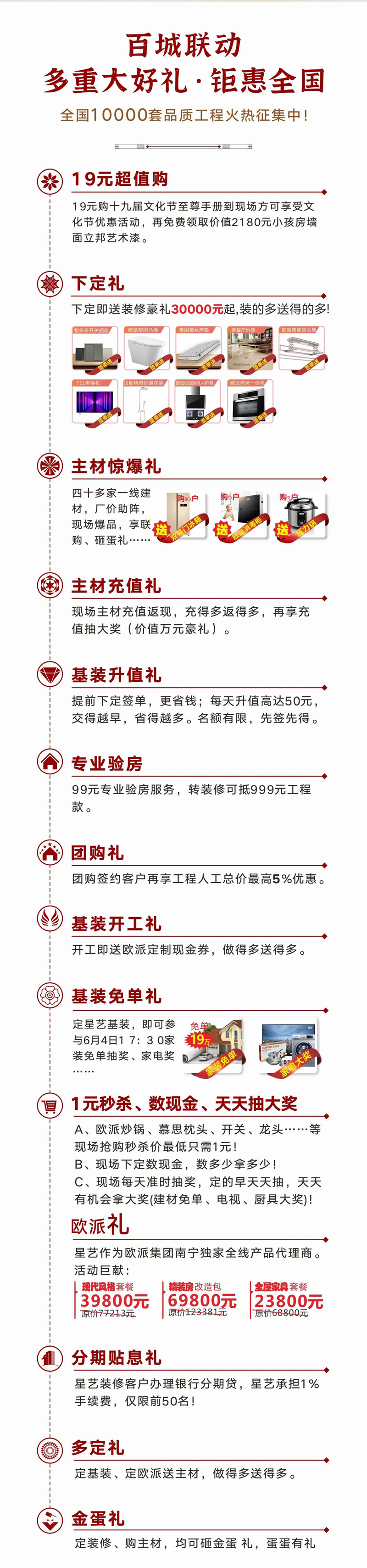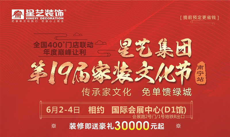 2023年中國星藝第19屆家裝文化節(jié),全國400多家直營門店聯(lián)動,年度巔峰讓利,搶2億裝修豪禮,讓幸福啟程。星藝人將以最專業(yè)的團隊,最經典的設計,最貼心的服務、最堅實的品質、最期待的鉅惠,將一場裝飾文化盛宴,獻禮綠城,具體優(yōu)惠如下: