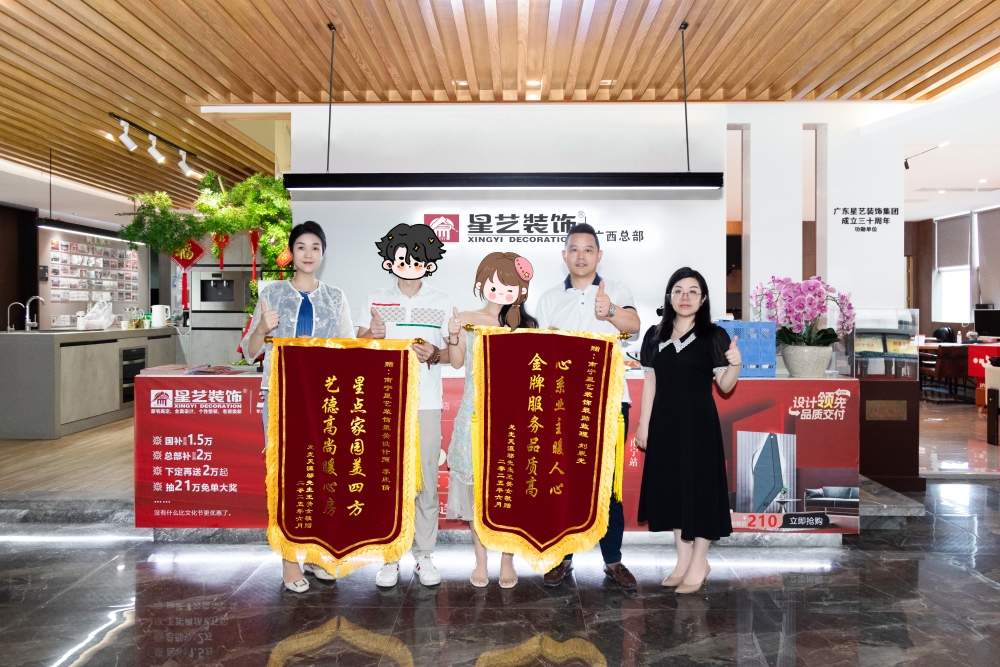 2025年6月12日,星藝裝飾集團(tuán)南寧分公司匯東店內(nèi)洋溢著喜悅與榮光。滿懷感激的業(yè)主親臨門店,將兩幅飽含深情贊譽(yù)的朱紅錦旗,分別贈予設(shè)計(jì)師李欣倩女士與項(xiàng)目經(jīng)理劉晨光先生,并與他們親切合影,共同記錄下這彰顯卓越服務(wù)與深厚情誼的珍貴時(shí)刻。