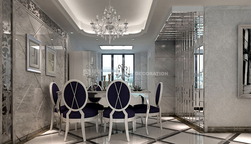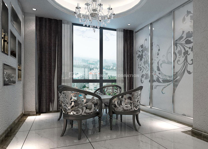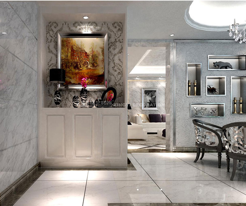 本案地處南寧市柳沙半島,擁有獨特的地理位,地高勢且面向一線江景,可謂居家之風水寶地。業(yè)主是一對新婚的夫妻。以客廳和餐廳及開放式廚房為中軸線貫穿的設計主次分明,通風效果利用到了極致,白色的歐式家具與進口墻布和水刀切割的精致拼花相互搭配,豐富著室內的生活氣息,時尚而又華麗,浮現(xiàn)出一幅美麗的畫面,令人心曠神怡,,同時也是象征著一對新人愛情的神圣與純潔。