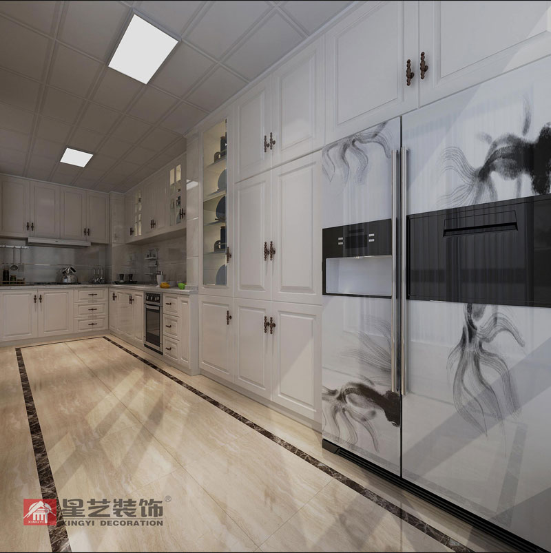 鳳景灣140平裝修案例設計說明:喜歡做美食就必須要有個大廚房,所以我就把生活陽臺納入廚房,這樣廚房空間就大很多,這樣才能滿足施展廚藝的大空間。