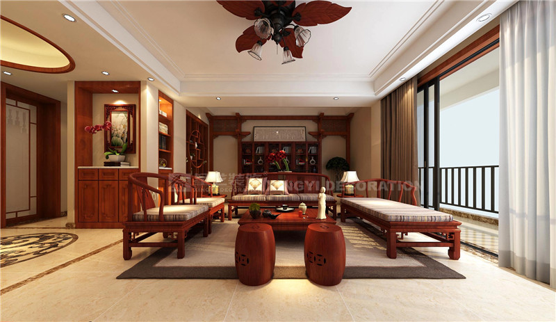 中式的設(shè)計(jì)元素在這里隨處可見(jiàn),客廳電視背景兩邊的實(shí)木雕花、沙發(fā)背景的古代牌坊造型、古韻十足的中式沙發(fā)、以及餐廳推拉門和柜子門板的中式線條,無(wú)不流露出悠悠古風(fēng)。