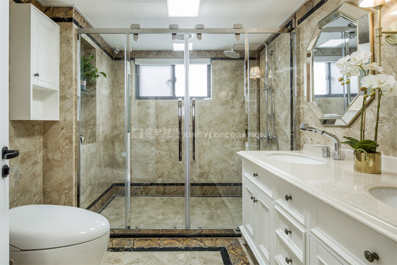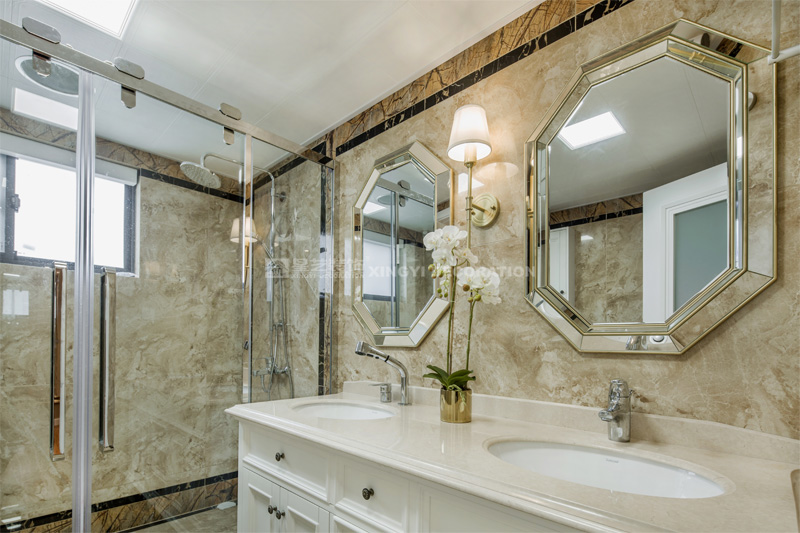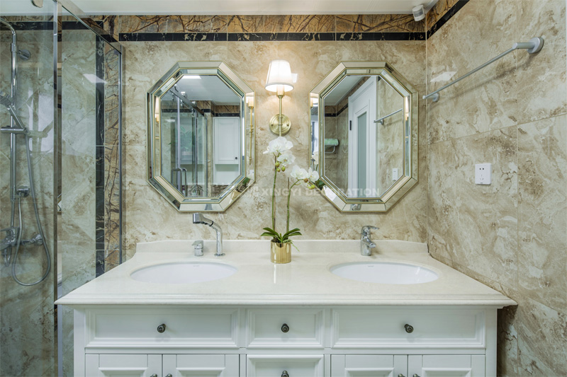 衛(wèi)生間簡潔素白的臺面、充滿質(zhì)感的大理石紋理地面、墻面,個性化的裝飾畫充滿現(xiàn)代感,干凈大氣的同時又不失格調(diào)。