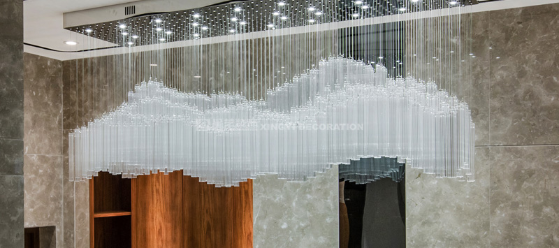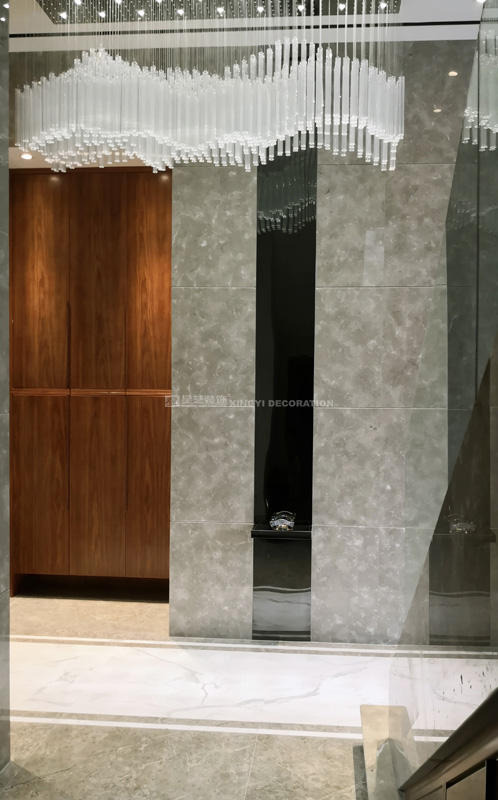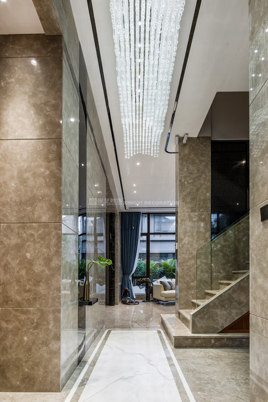 門廳先以水晶堆疊出雪山形象的吊燈,到地面同理用白色紋理的磚共同呼應本案主題。