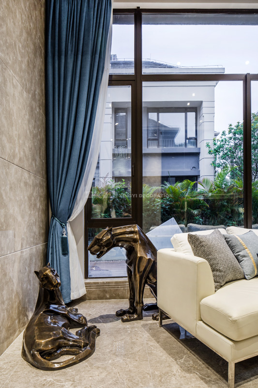 虎,傳統(tǒng)文化里的守護神,是正義和力量的象征。對著大門設置的一對美洲虎推門既見,虎虎生威。