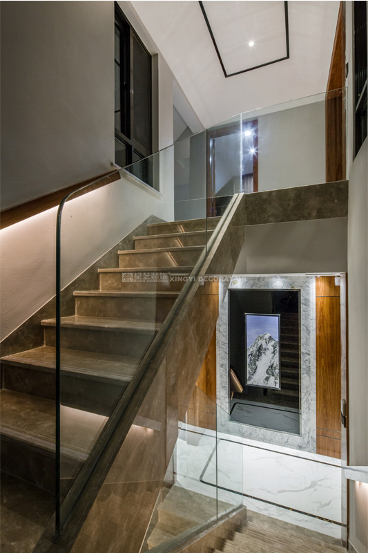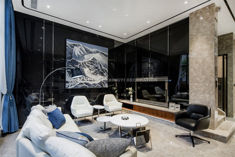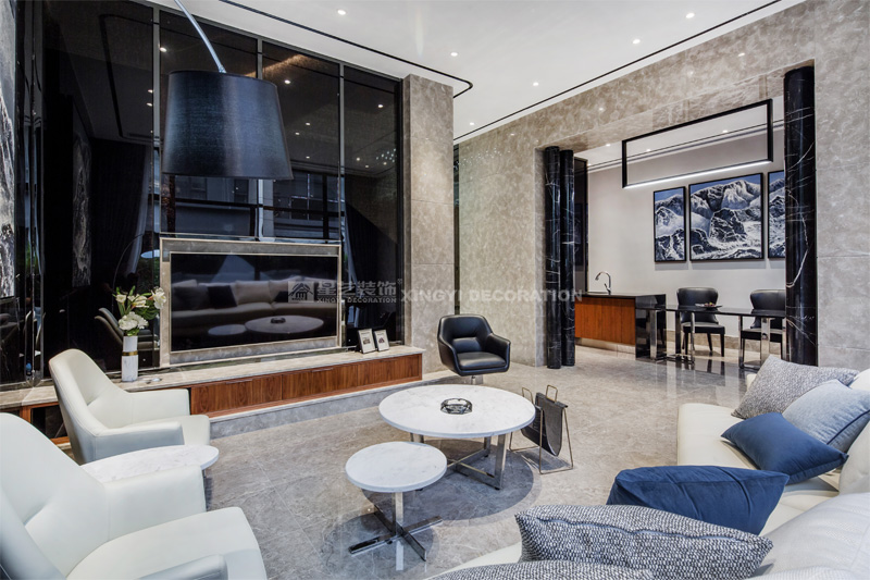 共公空間整體簡約的現(xiàn)代風格中還隱約透著些許輕奢的品格。4米8層高的空間里黑白灰的用色表達雪山的肅穆大氣,添一抹藍既是藍天也如清新的空氣令人沉靜。一組珠峰的主題油畫提升空間的文化意境。