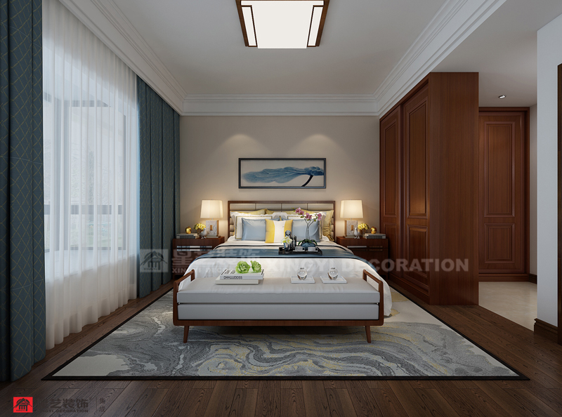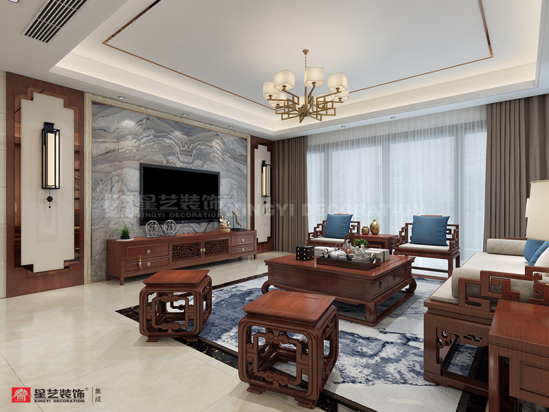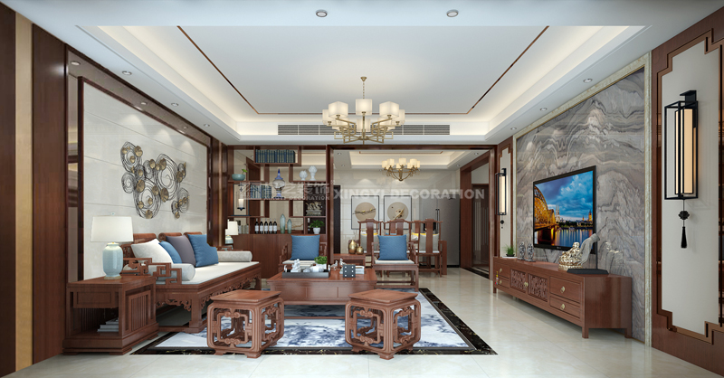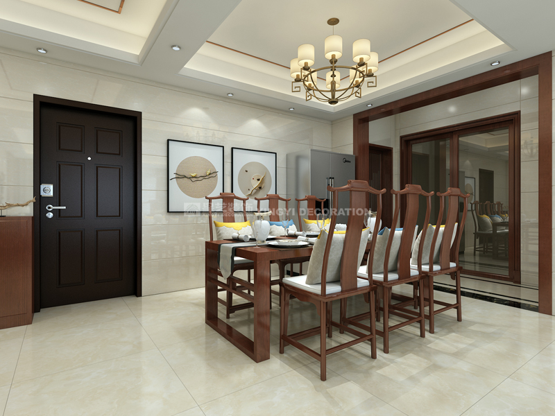 南寧星藝裝飾李發(fā)設計師專業(yè)設計的科瑞江韻新中式162平裝修案例,現代與傳統的碰撞,現代審美需求打造富有傳統韻味空間,設計上采用簡潔硬朗直線條。直線裝飾在空間中的使用,反映出現代人追求簡單生活的居住要求,更迎合了中式家具追求內斂、質樸的設計風格,使其更加實用、更富現代感。