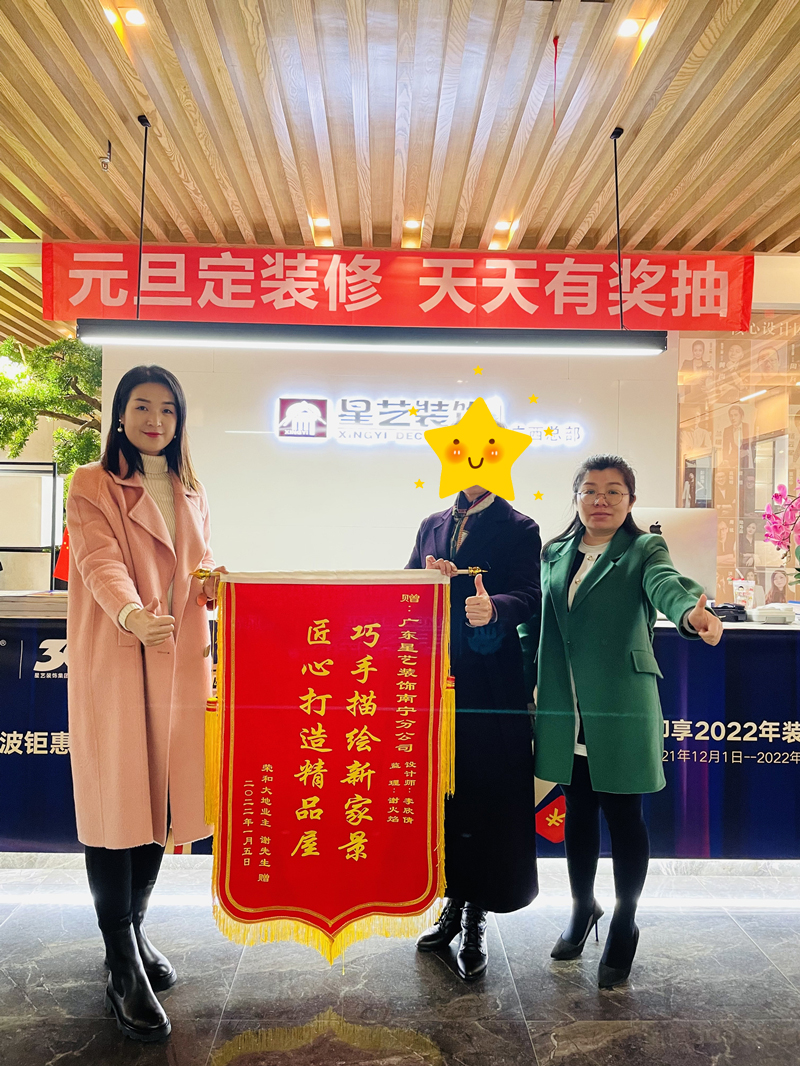 2022年元旦過后沒多久,榮和大地的業(yè)主謝先生送來錦旗一幅,錦旗內(nèi)容匠心打造精品屋,巧手描繪新家景,設(shè)計師李欣倩和業(yè)主合影留念