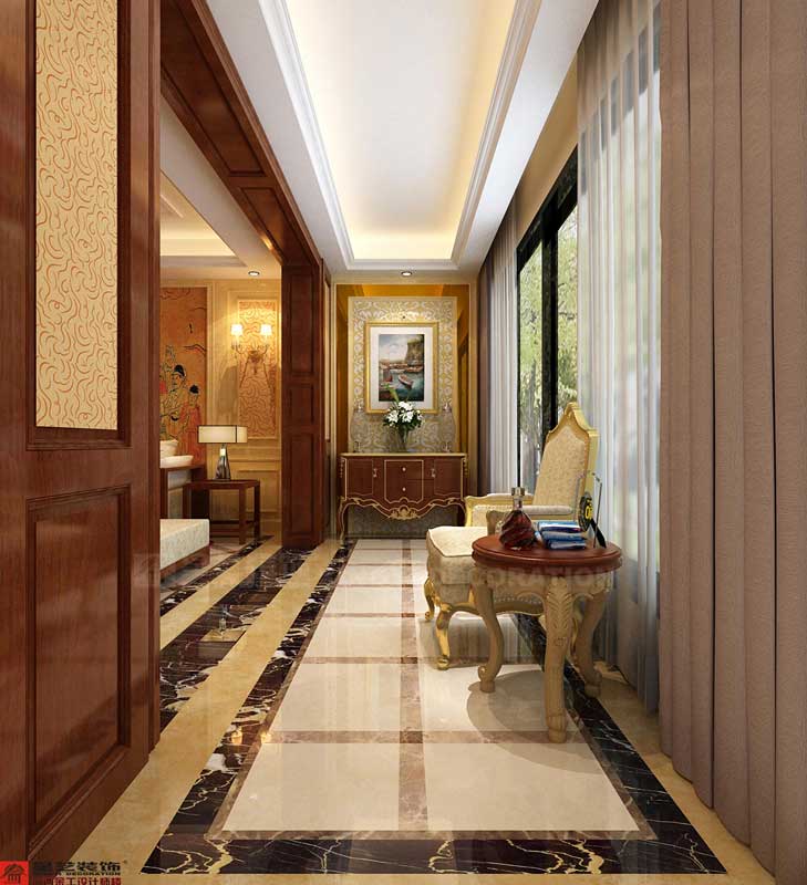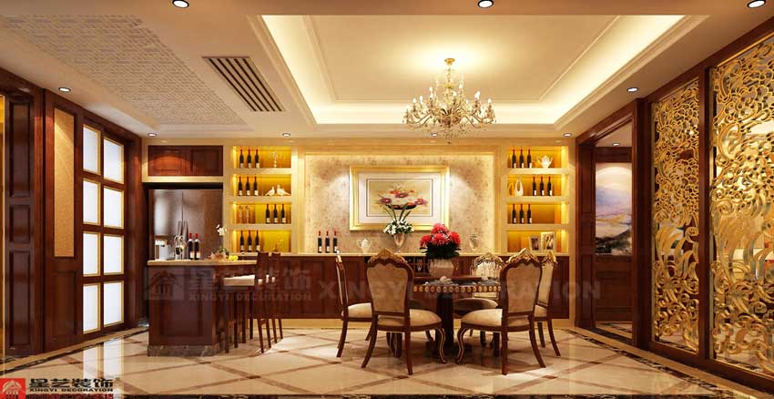 本案172平米,由于業(yè)主請過風(fēng)水先生,對于房子的色彩有要求,所以整個方案以暖色系為主,由于業(yè)主強(qiáng)烈要求以簡約中式家具為主,又喜歡歐式風(fēng)格,所以整個空間的配飾以歐式為主,比如吊燈,壁燈,餐廳與客廳之間用屏風(fēng)隔斷,加上所有空間的線條都是硬朗的直線條,所以整個空間看起來比較大氣。