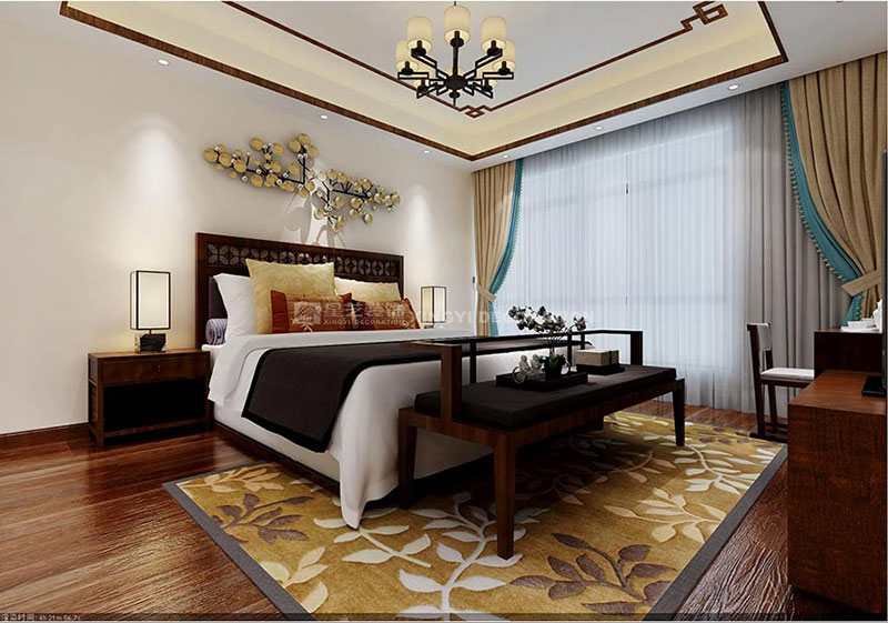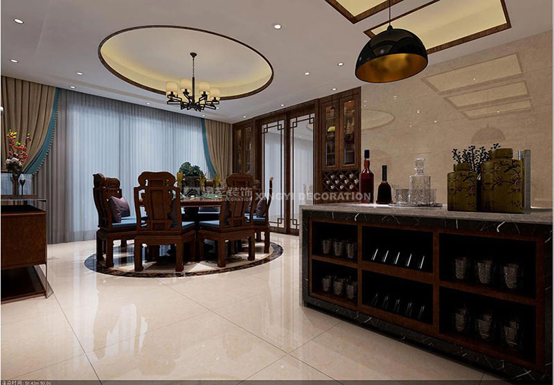 此戶型為6房2廳的結(jié)構(gòu),其中5間主人的房間都有獨立的衛(wèi)生間,使得日常生活使用非常的方便??蛷d、餐廳的面積比較大,設(shè)計師通過1米高的白墻和中式隔斷巧妙把它們分割開來,但從視線和空間效果來看它們又是緊密聯(lián)系在一起的,達到了“隔而不斷”、又有中式園林中“借景”的效果。電視背景墻采用個性化的復(fù)合木地板上墻,簡潔大方,通過隱形門的設(shè)計巧妙的把多功能房的門修飾起來。餐廳設(shè)置有一個吧臺區(qū)域,既使用又美觀。業(yè)主不喜歡太繁瑣的裝飾,所以每一個臥室都沒有按常規(guī)設(shè)計背景墻,只是通過吊頂造型和墻面顏色營造不同的氛圍。