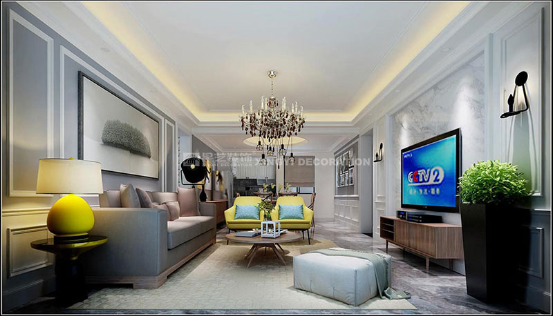 客廳以灰白為基調,電視背景中央采用整塊的進口爵士白大理石,既簡潔大方、又高雅精致,墻面的石膏線框設計顯現(xiàn)出新古典的設計元素, 跳躍的黃色布藝沙發(fā)和臺燈使客廳瞬間活躍起來,也成為了客廳效果圖的點睛之筆。