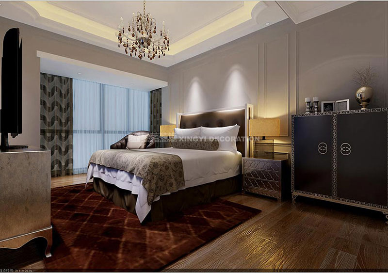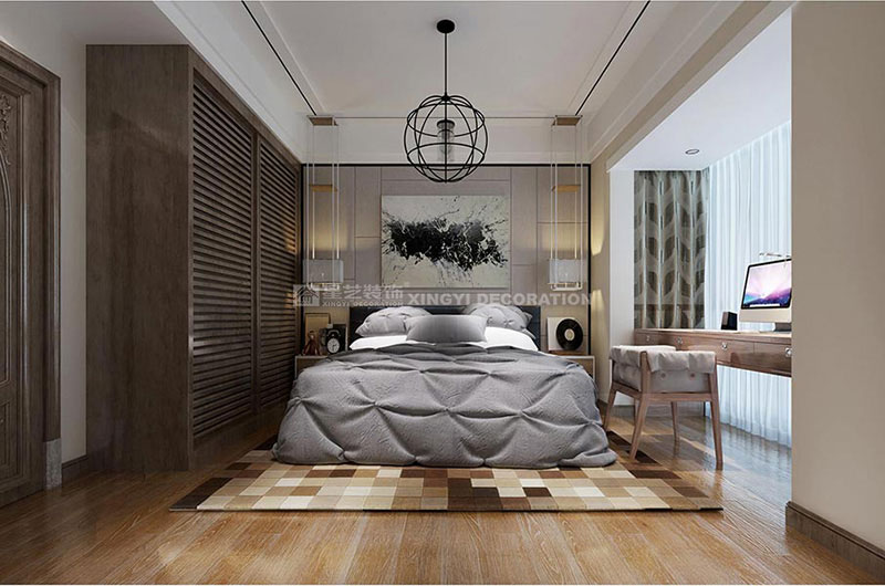 主臥墻面咖啡灰的選色,使整個空間顯得格外的寧靜,舒適中帶著高貴的氣質,床頭背景的石膏線框,與客餐廳的設計遙相呼應,整個空間也不會顯得過于單調。