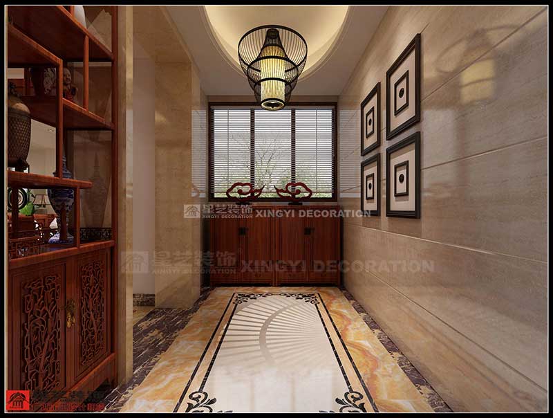 本案例采用拋釉磚(明)與木通花(暗)的對(duì)比,加上大理石(硬)與墻布(軟)的搭配,營(yíng)造出一個(gè)明亮,現(xiàn)代的中式之家