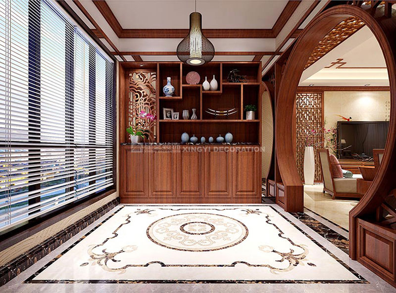人對一個空間的感覺是在前七秒產(chǎn)生,所以入戶區(qū)對整個空間的重要性。 進入本案例,映入眼簾的是:左邊是小區(qū)花園的美景(把室外的引入,做到室內(nèi)外相交融),右邊是曲線美的月亮門,讓中式空間的延伸更有內(nèi)涵。正對的是整面的裝飾博古架,擺放著主人精心呵護的綠植、有旅游帶回來的飾品擺件、有中式的青花瓷,還有。。。。。。