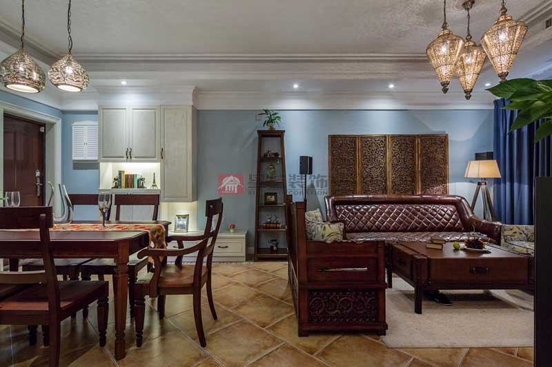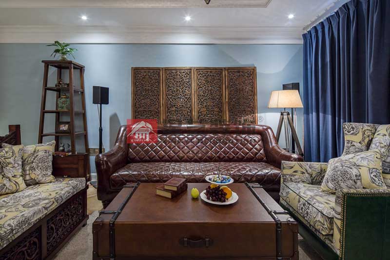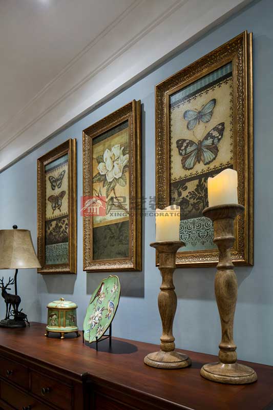 本案為美式休閑風(fēng)格,以自然色調(diào)為主,白色天花與藍(lán)色墻漆相襯;別致的小飾品,搭配精致的家具,一一體現(xiàn)了隨意放松的生活方式。