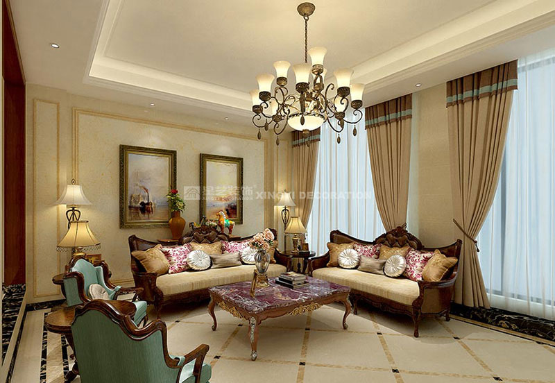 客廳:客廳作為待客區(qū)域,一般要求簡潔明快,同時裝修較其它空間要更明快光鮮,使用大量的石材和仿古藝術品,這不僅反映在軟裝擺件上對仿古藝術品的喜愛,同時也反映在裝修上對各種石材的偏愛和對各種仿舊工藝的追求。總體而言,美式風格的客廳是寬敞而富有歷史氣息的。