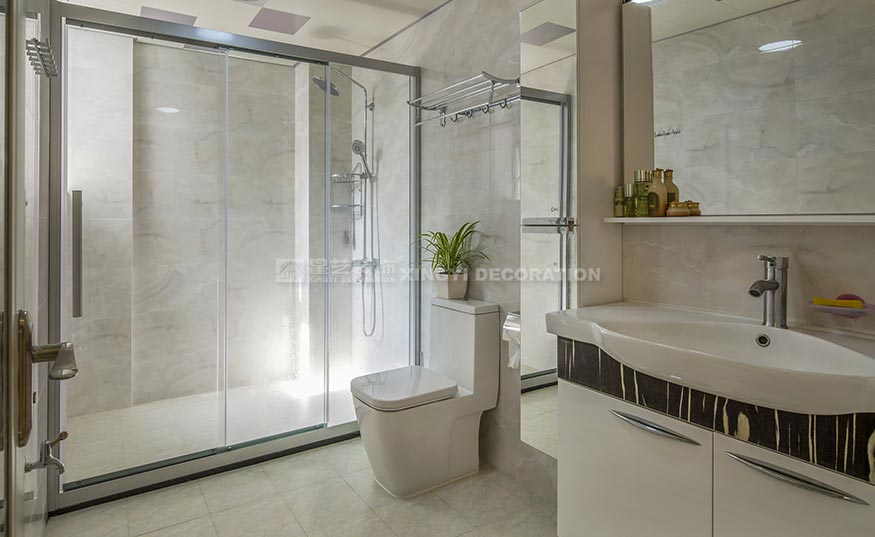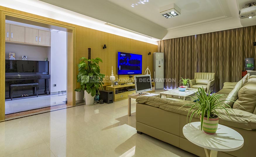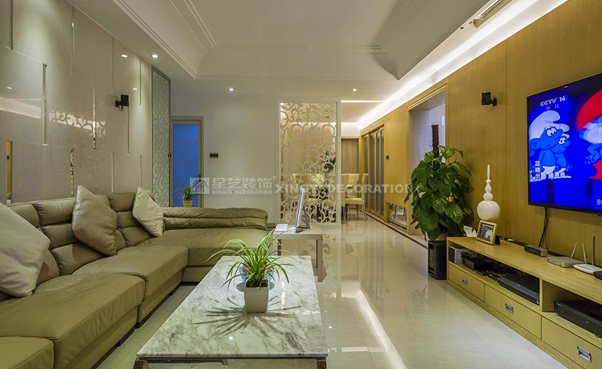 玄關(guān)的面積較大,為了充分利用空間,在與業(yè)主溝通后把原來鋼琴放置在這里,增添了一絲音樂的氣息。魚缸則讓人感受到空間的活力。為了營造玄關(guān)的藝術(shù)氛圍,玄關(guān)處采用了大幅馬賽克裝飾畫,豐富了空白單調(diào)的墻面??蛷d與餐廳原本是相連的,在與業(yè)主溝通后覺得兩者之間太空洞了,空間顯得過于單薄,沒有層次感。為了不影響采光,把客廳和餐廳之間設(shè)計了鏤空圖案隔斷,不僅隔開兩個功能區(qū)域,還能制造出錯落有致的光影,使得光線能隨著人與日光的變換而變換,讓客廳倍具時尚感。隔斷的圖案與客廳背景一致,這樣空間更加對稱,也更加有層次感??蛷d的整體色調(diào)為木色,沙發(fā)背景用了冷色調(diào),冷暖對比,在空間里增添一些綠色植物,木色撞上綠色植物,讓人一進入空間就有一種進入大自然的感覺。臥室統(tǒng)一色調(diào)溫馨靜謐,主衛(wèi)采用了現(xiàn)代感極強的光面白色瓷磚,潔具選擇上選擇了白色為主,使空間看起來更加簡潔干凈。